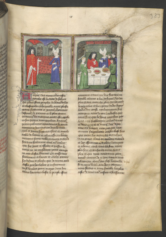 Vienna, Österreichische Nationalbibliothek, 2561, f. 383r. Gualtieri ripudia la moglie Griselda; durante il banchetto per le finte nozze Griselda viene riaccolta nella casa del marchese e si ricongiunge con i propri figli.