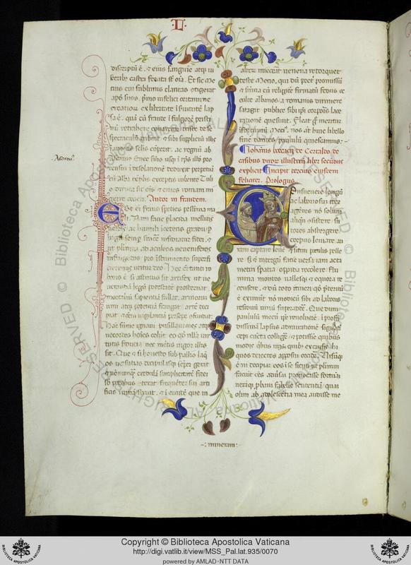 Città del Vaticano, Biblioteca Apostolica Vaticana, Pal. lat. 935, f. 32v. Il copista del manoscritto è Marco de' Rafanelli. Personificazioni della Fortuna, rappresentata come una regina dalla veste sontuosa, e della Povertà, rappresentata come un mendicante (un frate?) dall'abito stracciato, all'interno dell'iniziale figurata C(onsuevere).
