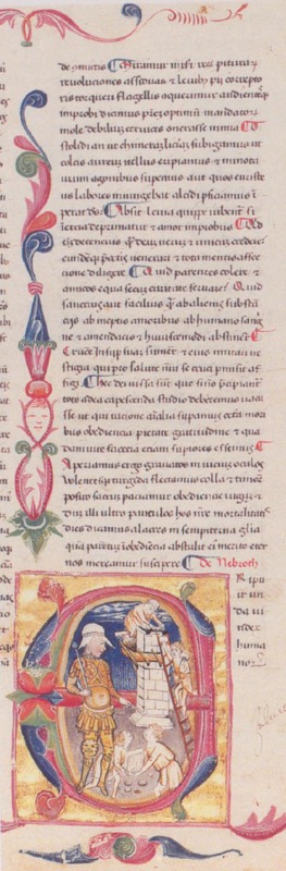 Copenaghen, Det Kongelige Bibliotek, GKS 472 2°, f. 3r. Il secondo copista del manoscritto è Beltramo di Leonardo Mignanelli da Siena. Il gigante Nembrot, con scettro e armatura, sorveglia quattro manovali che erigono la Torre di Babele, all'interno dell'iniziale istoriata E(ripuit).