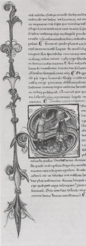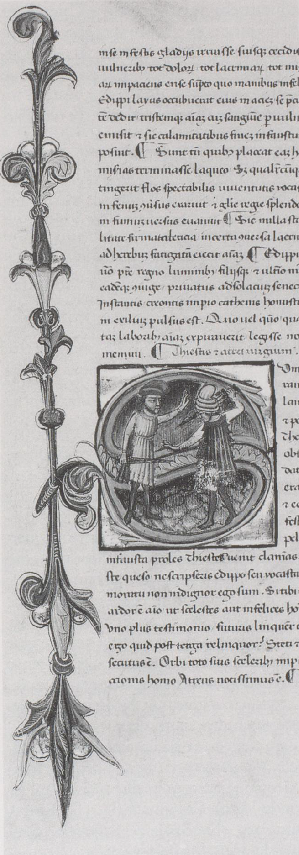 Copenaghen, Det Kongelige Bibliotek, GKS 472 2°, f. 6v. Il secondo copista del manoscritto è Beltramo di Leonardo Mignanelli da Siena. Tieste e Atreo si affrontano con le spade sguainate, all'interno dell'iniziale istoriata S(umpseram).