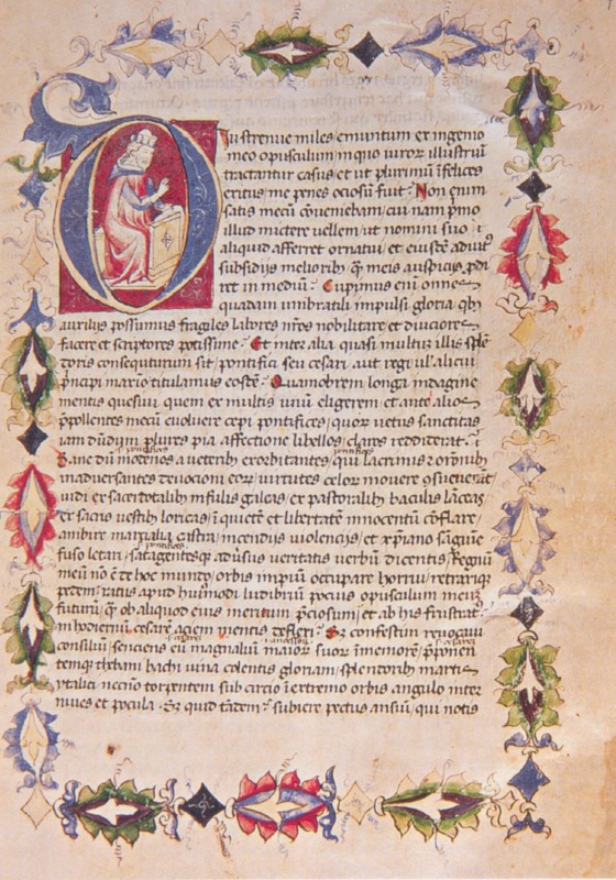 Salamanca, Biblioteca de la Universidad, 2246, f. 4r. L'autore Giovanni Boccaccio seduto allo scrittoio, all'interno dell'iniziale figurata D(iu).