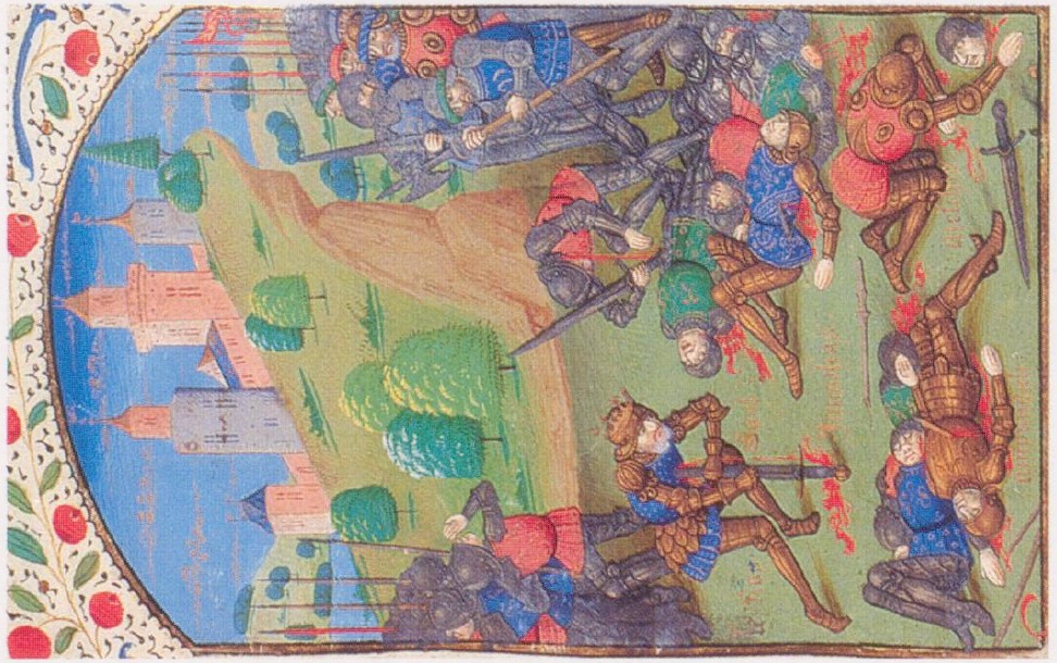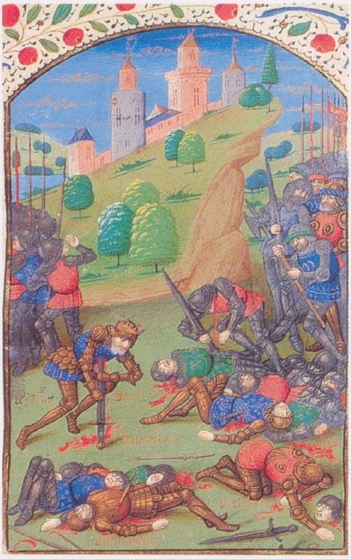 Miniatore di Rouen (1480 c.), Il suicidio di Saul; l'esercito nemico avanza sul campo di battaglia