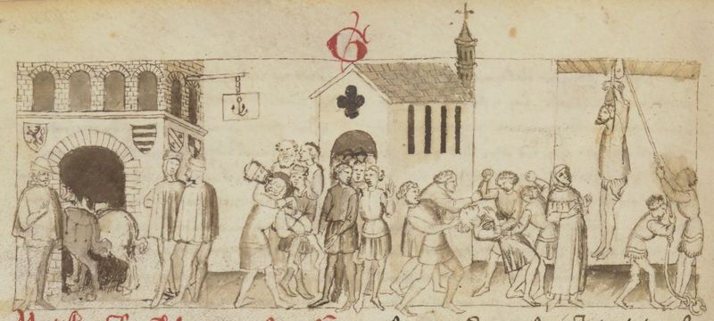 Parigi, Bibliothèque Nationale de France, It. 482, f. 23v. Il copista del manoscritto è Giovanni d'Agnolo Capponi. Martellino e i suoi amici entrano nella città di Treviso; Martellino si finge paralitico per entrare nella chiesa dove è deposto Sant'Arrigo; Martellino viene picchiato dalla folla; un giudice sovrintende alla tortura di Martellino.