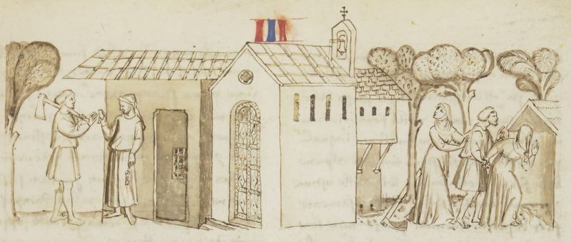 Miniatore fiorentino (1360-1390), Masetto chiede al castaldo il permesso di entrare nel convento; due monache conducono Masetto in una capanna