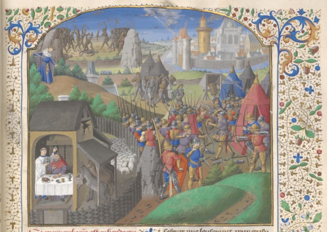 Londra, British Library, Add. 35321, f. 34r. Dinanzi a una tavola imbandita Samuele consacra Saul re con l'olio santo; l'esercito di Saul affronta quello dei Filistei; sullo sfondo, in seguito alla sconfitta sul Monte Gelboe, Saul compie il suicidio gettandosi sulla propria spada.