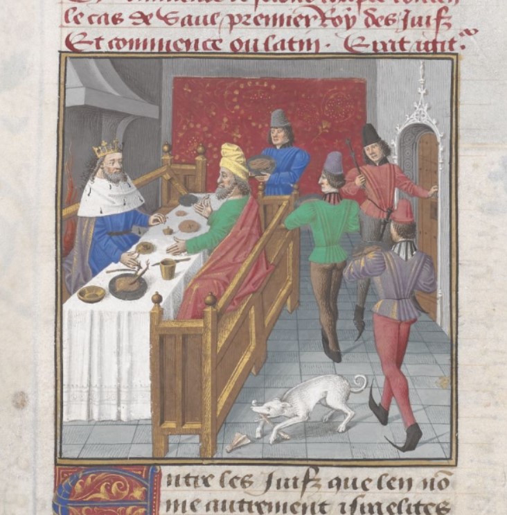 Londra, British Library, Add. 35321, f. 34v. Re Saul siede a banchetto con Samuele, mentre quattro uomini servono le pietanze.