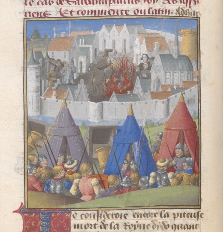Londra, British Library, Add. 35321, f. 46v. Sardanapalo si getta nelle fiamme con i suoi tesori; all'esterno delle mura si trova l'esercito degli assedianti.
