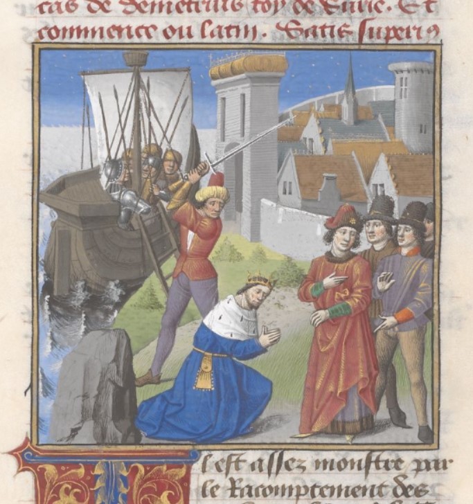 Londra, British Library, Add. 35321, f. 173r. Demetrio giunge a Tiro con una nave e viene decapitato.