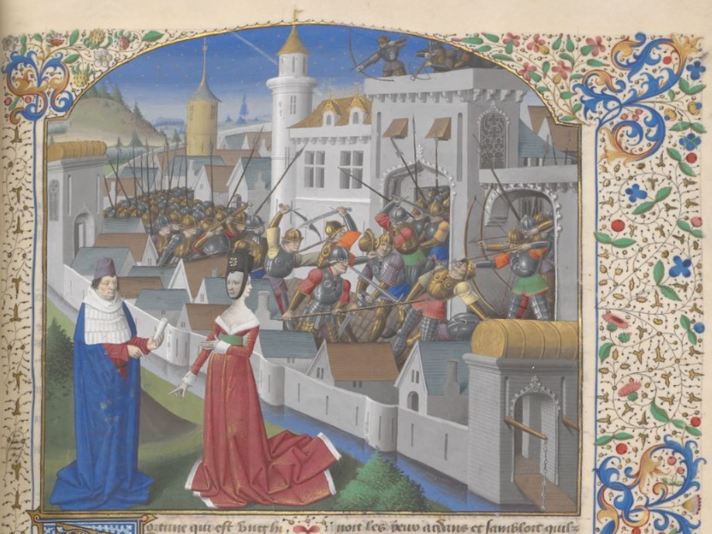 Londra, British Library, Add. 35321, f. 180r. L'autore Giovanni Boccaccio discute con la Fortuna, rappresentata come una donna bifronte; un esercito prende d'assalto le mura di una città.