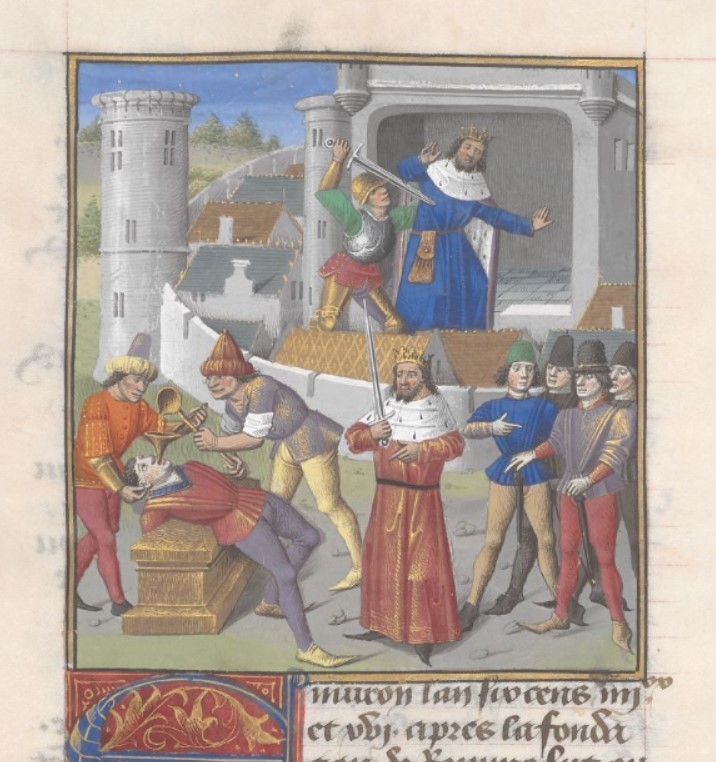 Londra, British Library, Add. 35321, f. 195v. Orode assiste all'esecuzione di Crasso, cui viene fatto ingoiare dell'oro fuso; all'interno della città Orode viene ucciso da Fraate.