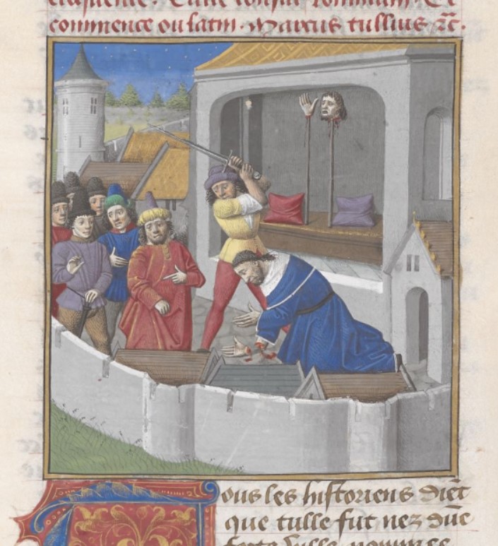 Londra, British Library, Add. 35321, f. 209r. Cicerone, cui è stata amputata la mano destra, viene decapitato; la mano e la testa di Cicerone vengono esposte in un'aula del Senato.
