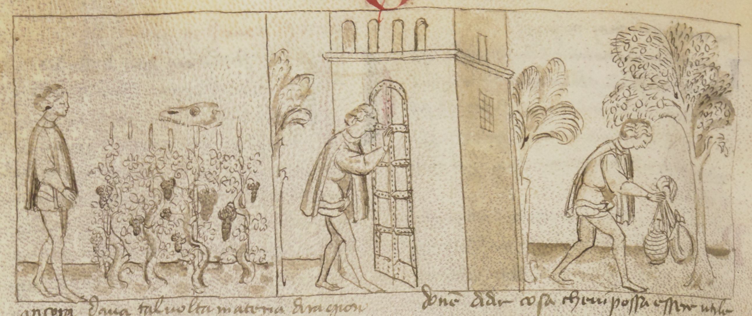 Miniatore fiorentino (1360-1390), Federigo di Neri Pegolotti attraversa un vigneto; Federigo bussa alla porta di Gianni Lotteringhi; Federigo recupera del cibo e del vino