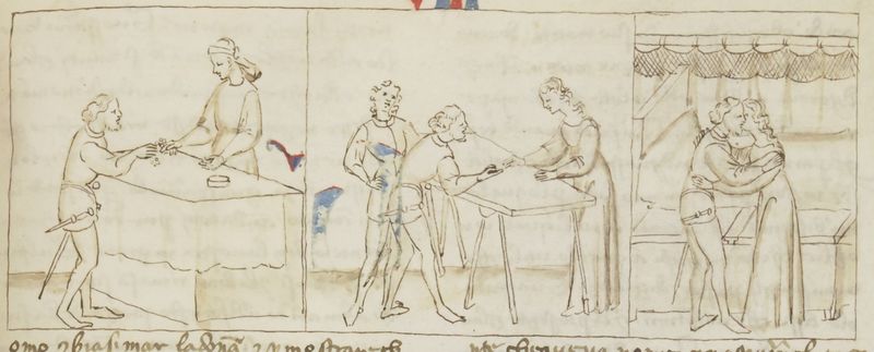 Miniatore fiorentino (1360-1390), Guasparruolo presta dei soldi a Gulfardo; Gulfardo consegna il denaro ad Ambruogia; i due amanti si scambiano un bacio