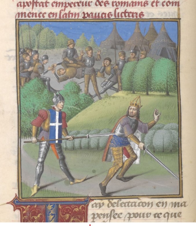 Londra, British Library, Add. 35321, f. 263v. Giuliano l'Apostata viene trafitto alle spalle da Mercurio; Mercurio, tornato accanto al cadavere, viene circondato da una folla di uomini attoniti e in preghiera.