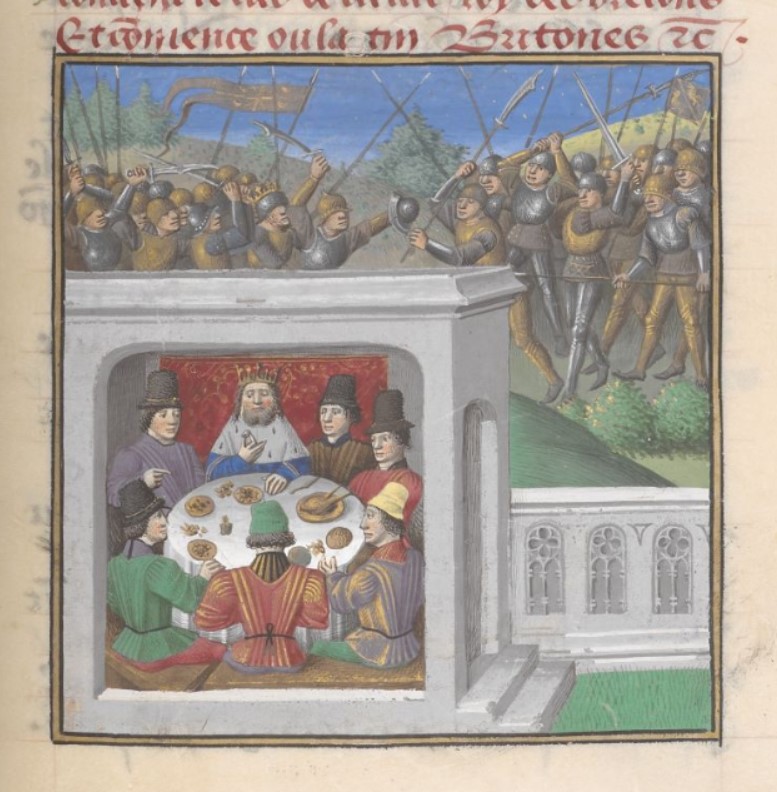 Londra, British Library, Add. 35321, f. 277r. Re Artù siede alla Tavola Rotonda con i suoi cavalieri; sullo sfondo l'esercito di Artù affronta i soldati di Mordred.