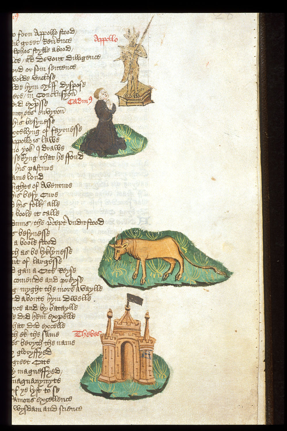 Londra, British Library, Harley 1766, f. 28r. Cadmo prega inginocchiato dinanzi una statua di Apollo; una giumenta su un prato; la città di Tebe.