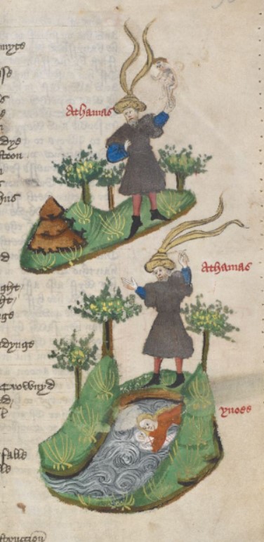 Londra, British Library, Harley 1766, f. 30r. Atamante, in preda alla follia, uccide il figlio Learco; Atamante assiste impotente mentre la moglie Ino annega con il figlio Melicerte.