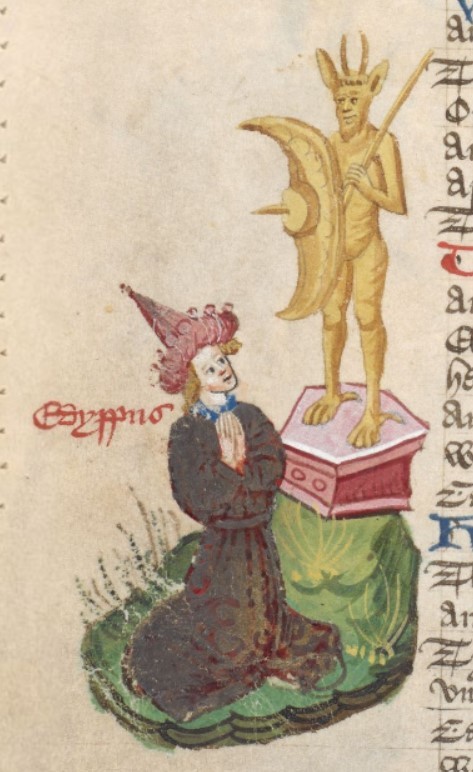 Londra, British Library, Harley 1766, f. 44v. Edipo prega inginocchiato dinanzi una statua di Apollo.
