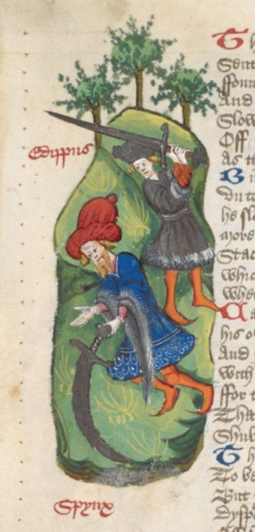 Miniatore inglese (1460 c.), Edipo uccide la Sfinge