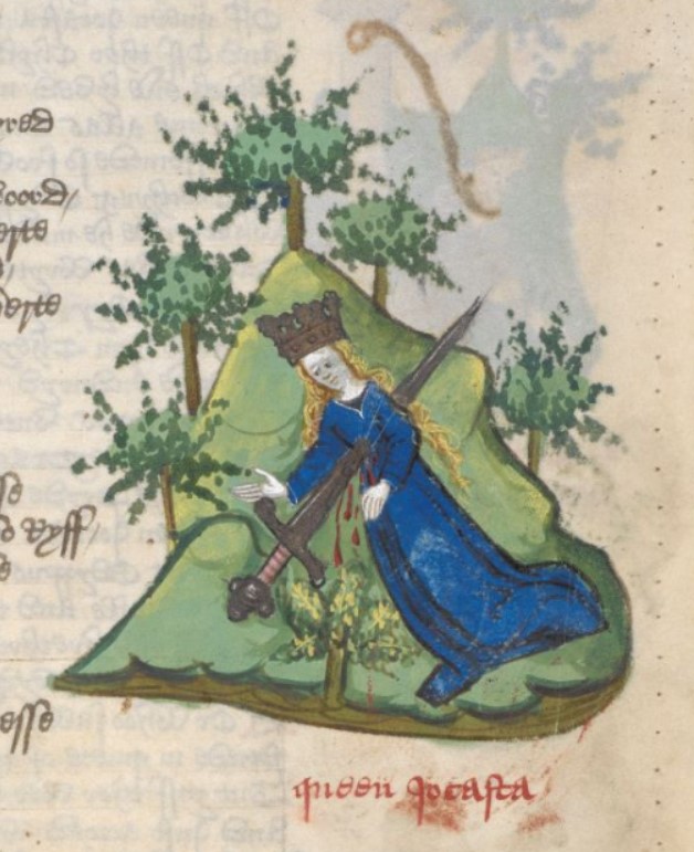 Londra, British Library, Harley 1766, f. 50r. Giocasta compie il suicidio trafiggendosi con una spada.