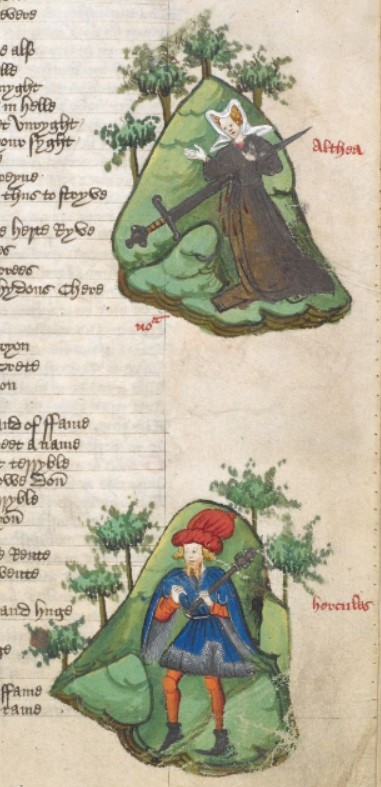 Londra, British Library, Harley 1766, f. 65r. La regina Altea, colta dai rimorsi, si suicida trafiggendosi con una spada; Ercole con una mazza tra le mani.