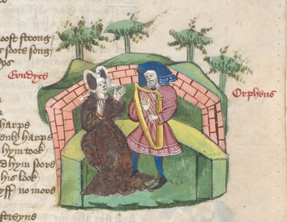Londra, British Library, Harley 1766, f. 76r. Orfeo suona l'arpa per la moglie Euridice.