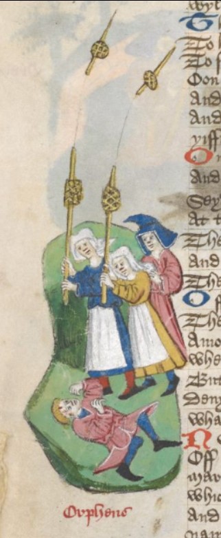 Londra, British Library, Harley 1766, f. 76v. Tre donne della Tracia colpiscono Orfeo.