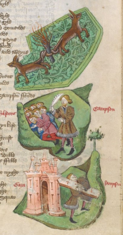 Miniatore inglese (1460 c.), Due volpi legate ad una torcia accesa; Sansone uccide i Filistei con la mandibola di un asino; Sansone scardina la porta della città di Gaza