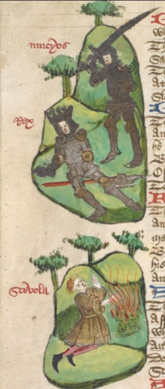 Londra, British Library, Harley 1766, f. 100v. Muzio Scevola uccide un re in armatura (indicato come «rex» nell'iscrizione, rappresenta in realtà lo scriba di Porsenna); Muzio Scevola pone la mano destra nelle fiamme del braciere.