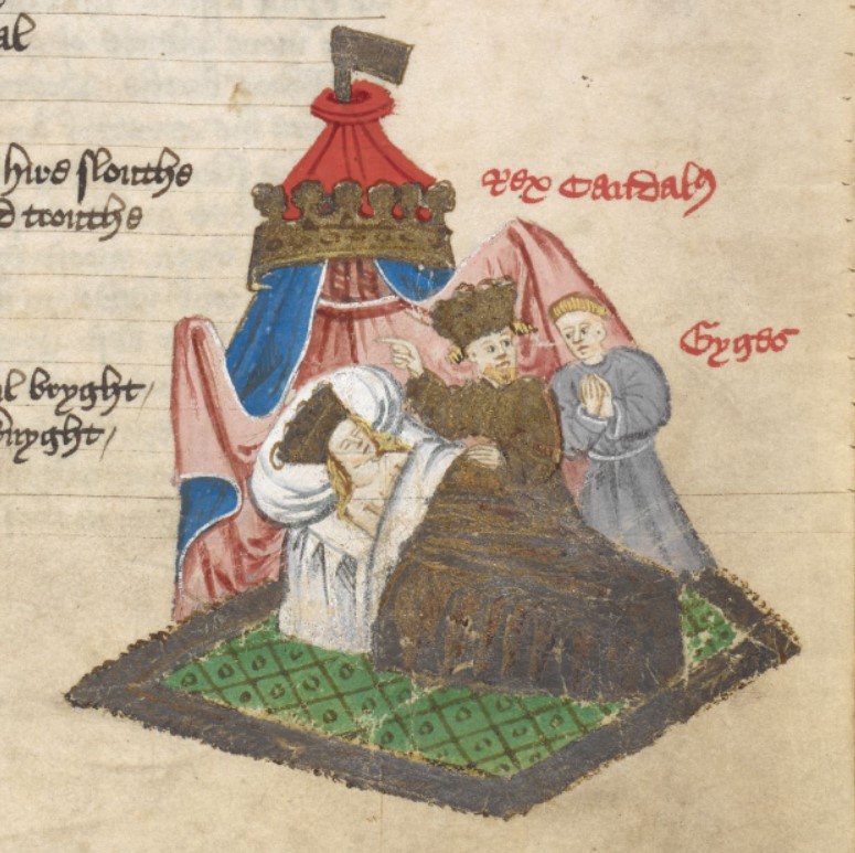 Londra, British Library, Harley 1766, f. 129r. Re Candaule mostra a Gige sua moglie nuda mentre questa dorme.