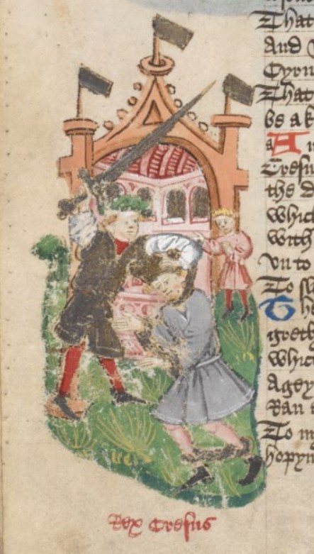 Londra, British Library, Harley 1766, f. 132v. Il figlio di Creso riacquista la parola alla vista del padre che sta per essere giustiziato.