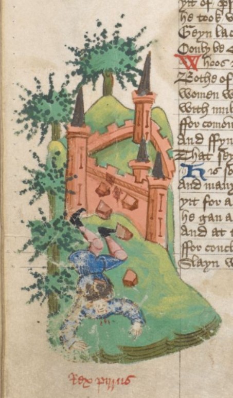 Miniatore inglese (1460 c.), Pirro muore cadendo da un tetto