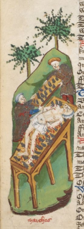Londra, British Library, Harley 1766, f. 159v. Attilio Regolo viene torturato tra due assi chiodate.