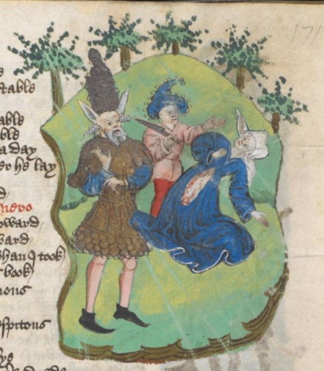 Londra, British Library, Harley 1766, f. 171r. Nerone, raffigurato con due orecchie d'asino, assiste all'assassinio della madre Agrippina da parte di un suo sicario.