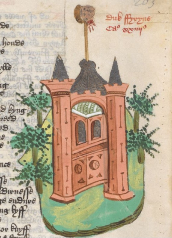 Londra, British Library, Harley 1766, f. 203r. La testa del generale Firmo è impalata su una picca e issata sulle mura di Cesarea.