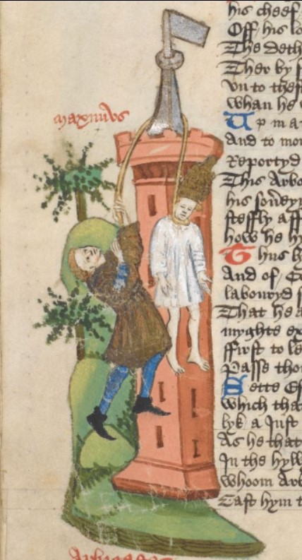 Londra, British Library, Harley 1766, f. 204v. Arbogaste impicca l'imperatore Valentiniano (erroneamente indicato come «Maximus») ad una torre.