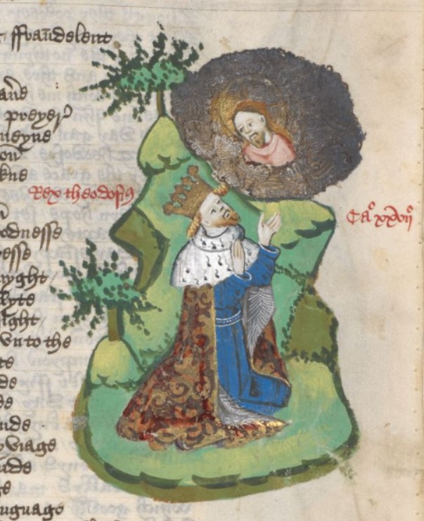 Londra, British Library, Harley 1766, f. 205r. L'imperatore Teodosio prega Cristo.
