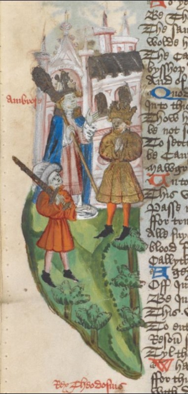 Miniatore inglese (1460 c.), Il vescovo Ambrogio incontra l'imperatore Teodosio