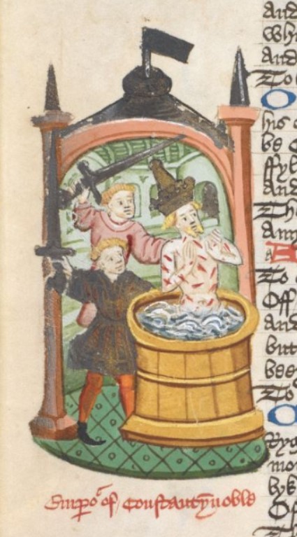 Miniatore inglese (1460 c.), Costantino III viene assassinato nel bagno