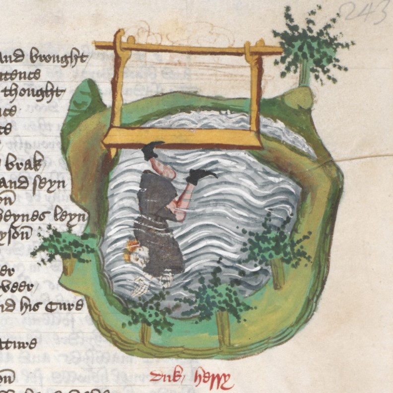 Londra, British Library, Harley 1766, f. 243r. Enrico VII, figlio di Federico II, cade da un ponte in un fiume.