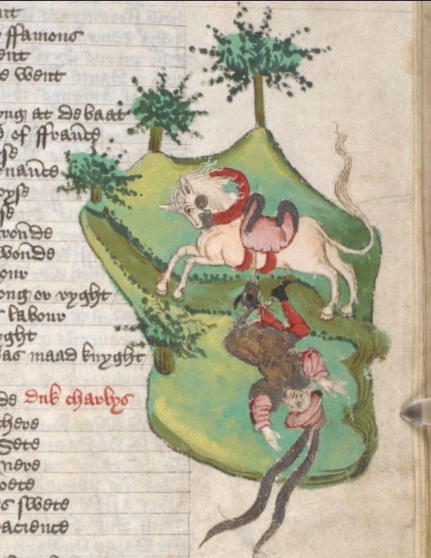 Londra, British Library, Harley 1766, f. 252r. Carlo di Taranto cade da cavallo colpito da una freccia.