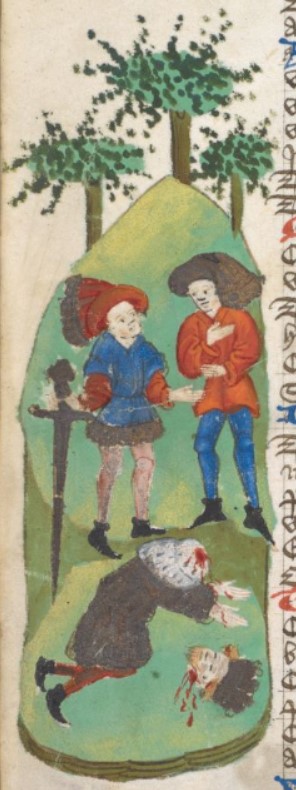 Londra, British Library, Harley 1766, f. 255v. Gualtieri VI di Brienne, duca d'Atene, viene decapitato da due uomini.