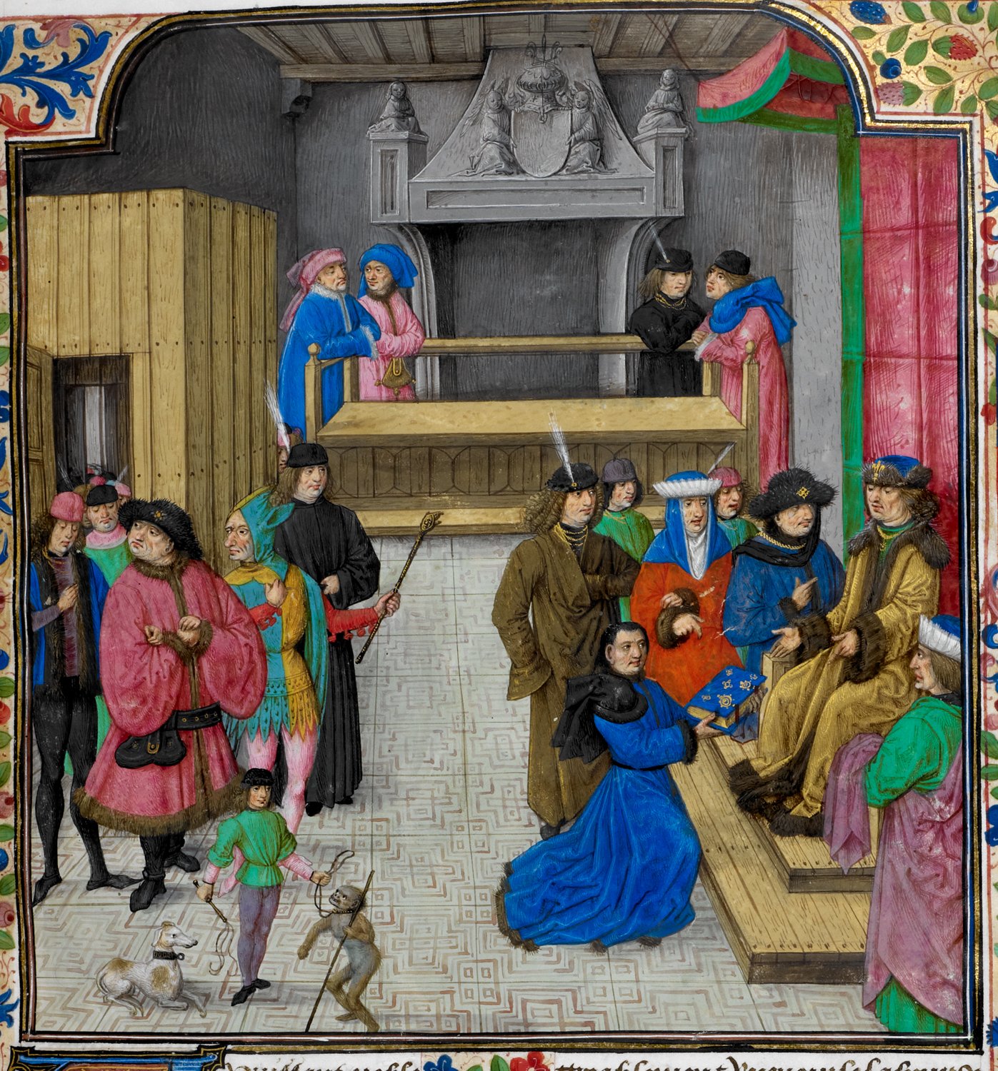 Londra, British Library, Royal 14 E V, f. 5r. Laurent de Premierfait si presenta a corte per offrire il libro al duca Jean di Berry.