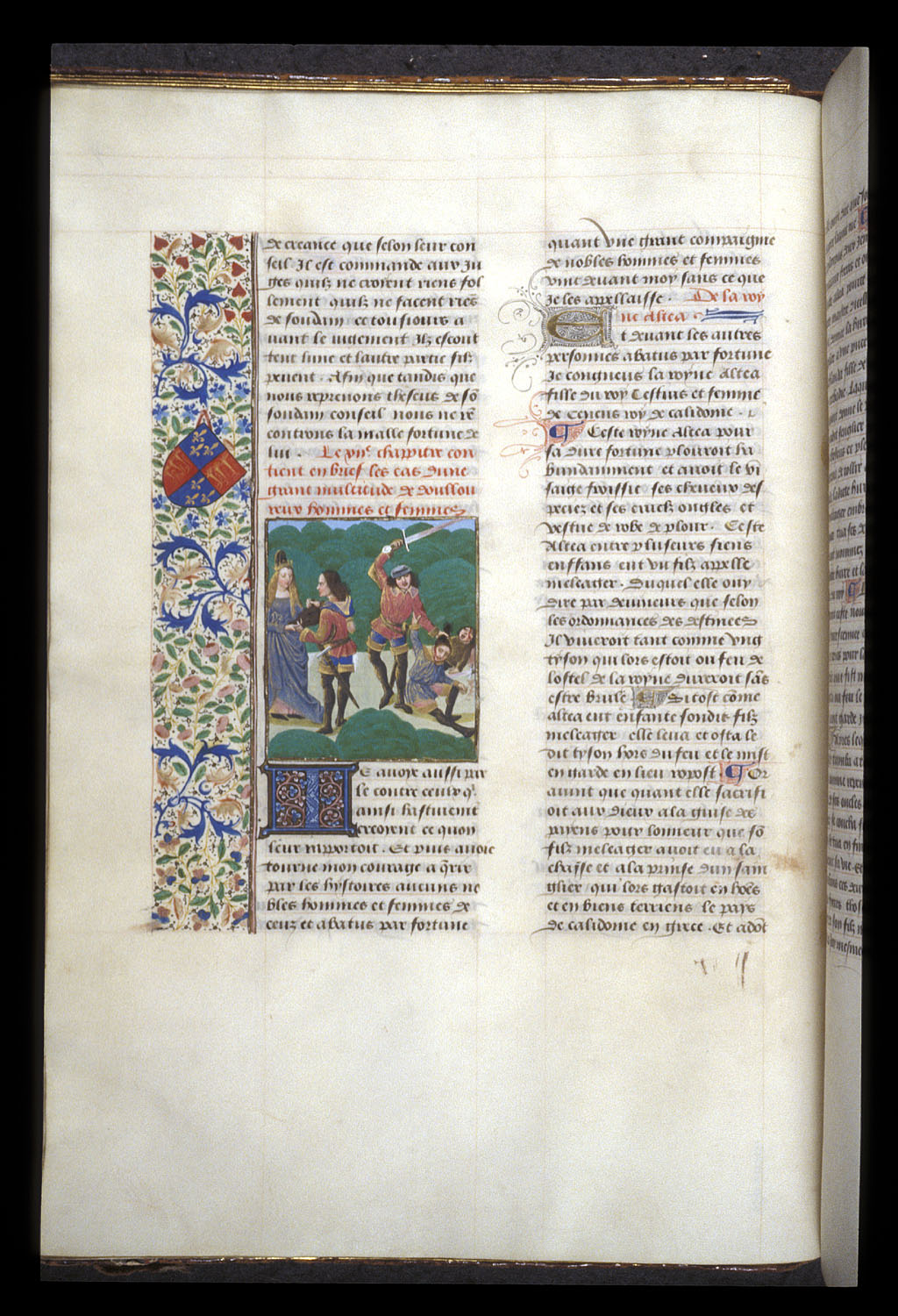 Londra, British Library, Royal 14 E V, f. 37v. Meleagro uccide i suoi due zii; Meleagro offre ad Atalanta la testa del cinghiale calidonio.