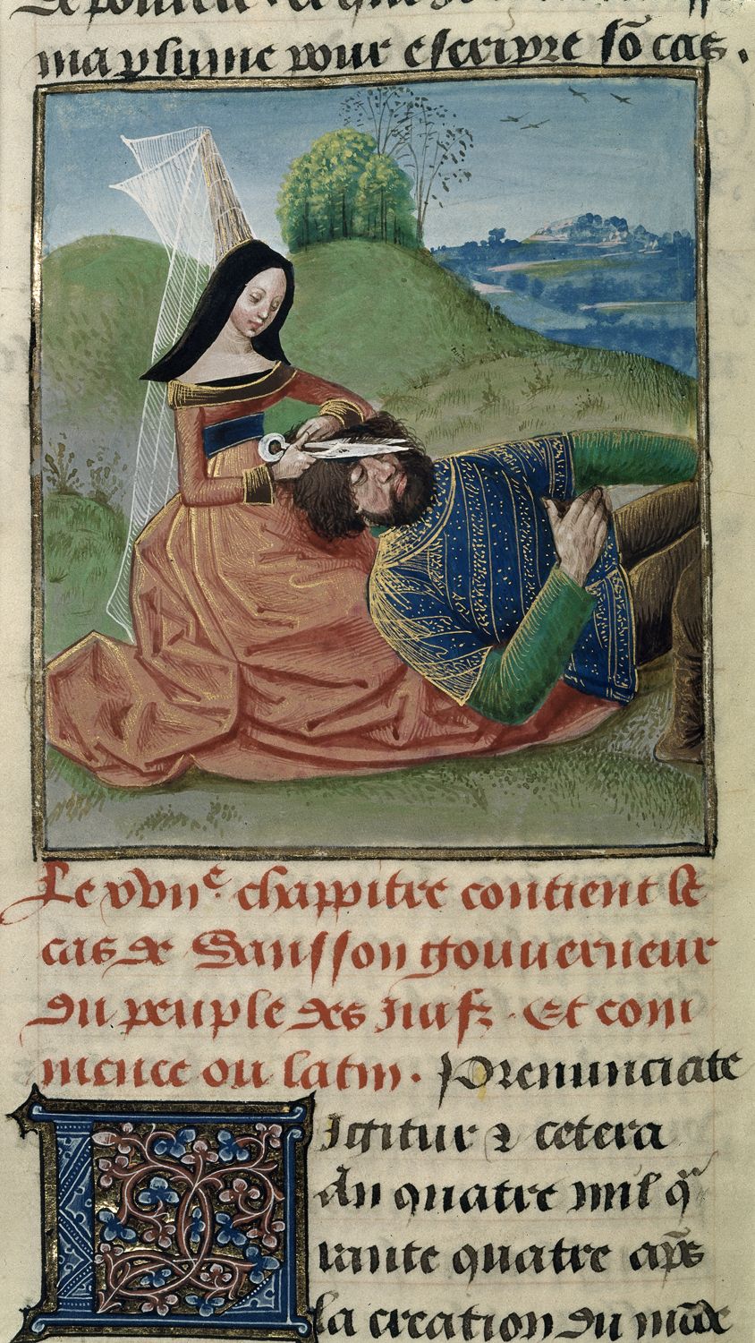 Londra, British Library, Royal 14 E V, f. 54v. Dalila taglia i capelli di Sansone mentre questi è addormentato.