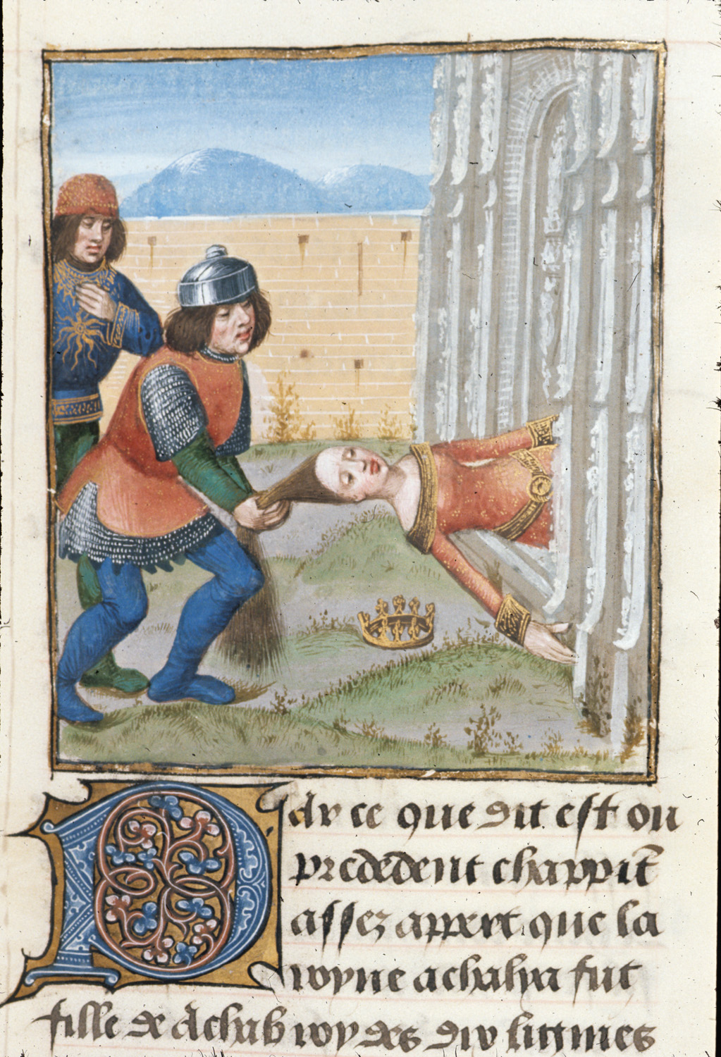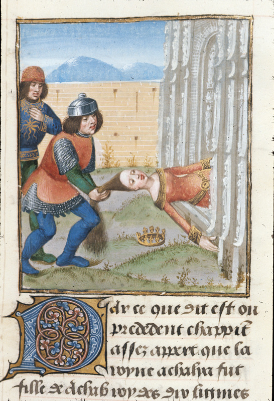Londra, British Library, Royal 14 E V, f. 74r. La regina Atalia viene trascinata per i capelli fuori le mura di Gerusalemme.