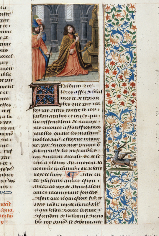 Londra, British Library, Royal 14 E V, f. 88r. Due uomini osservano Ozia bruciare l'incenso presso un altare.