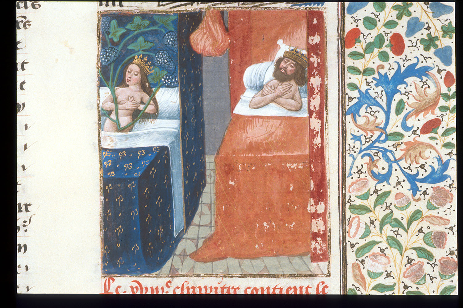 Londra, British Library, Royal 14 E V, f. 94r. Astiage sogna la figlia Mandane, dal cui corpo cresce una pianta di vite.