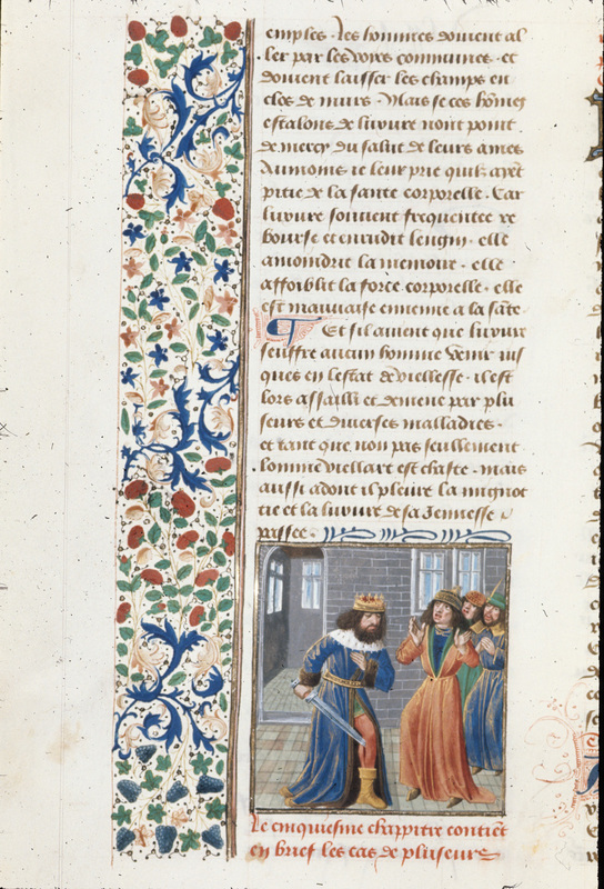 Londra, British Library, Royal 14 E V, f. 132v. Cambise si pugnala in una gamba di fronte a tre cortigiani.