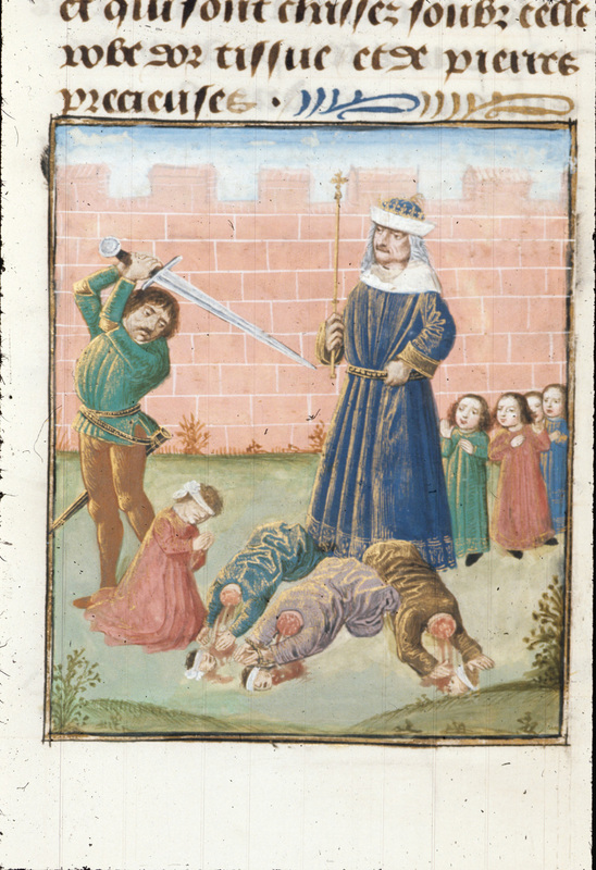 Londra, British Library, Royal 14 E V, f. 171v. I figli di Artaserse vengono decapitati.
